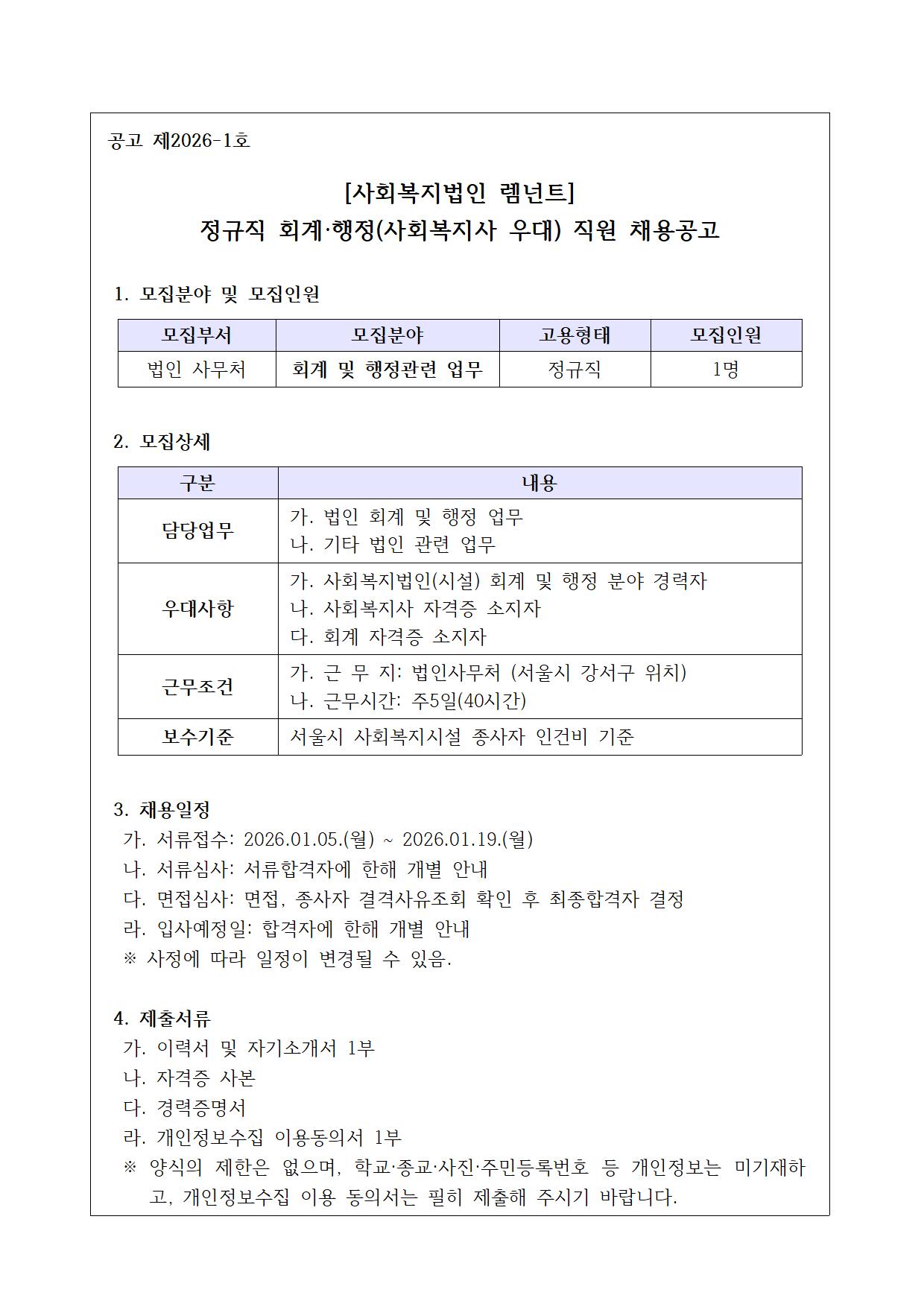 [마감] 정규직 회계·행정(사회복지사 우대) 직원 채용공고