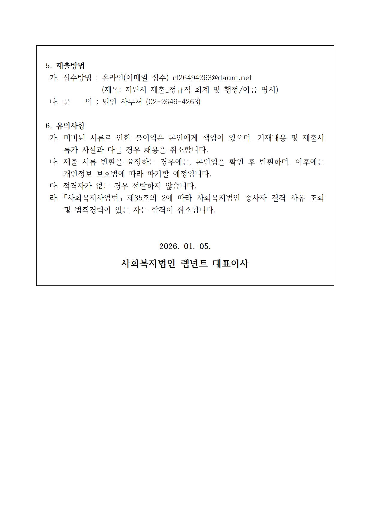 [재공고] 정규직 회계·행정(사회복지사 우대) 직원 채용공고