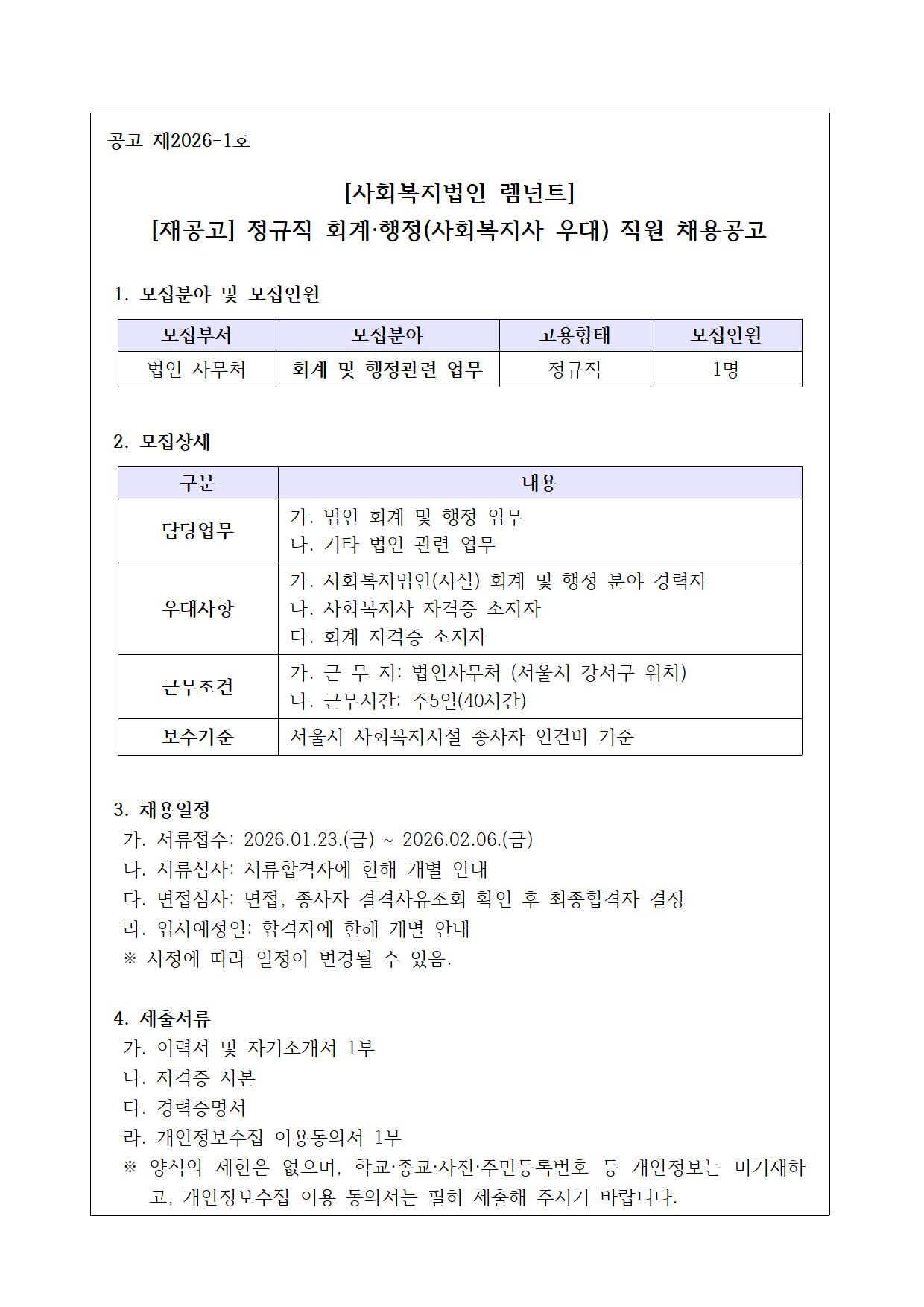 [재공고] 정규직 회계·행정(사회복지사 우대) 직원 채용공고